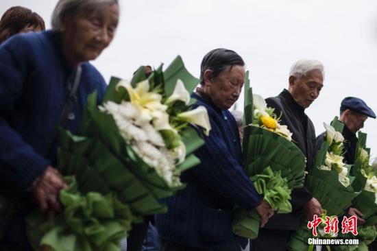 4月4日是清明节,南京大屠杀幸存者伍秀英、杨翠英、岑洪桂、夏淑琴、向远松、佘子清、马庭宝、葛道荣、刘民生、石秀英等以及死难者亲属共50多人,到侵华日军南京大屠杀遇难同胞纪念馆内,在哭墙(遇难者名单墙)前举行仪式,祭奠在侵华日军南京大屠杀中遇难的亲人和同胞。 中新社记者 泱波 摄