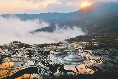 每当春耕,哈尼梯田放满水备耕到插秧前,梯田就成为万千面镜子,倒映着蓝天青山,气势磅礴。元阳当地人说,日出时应去多依树,日落时要去老虎嘴,如果想了解哈尼族的文化就得去箐口。