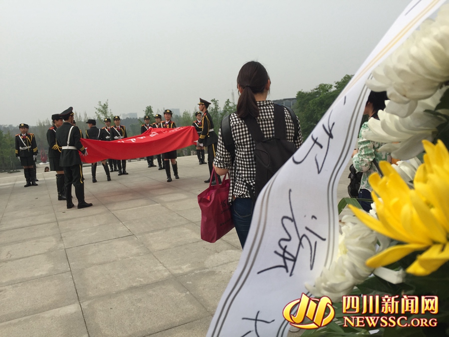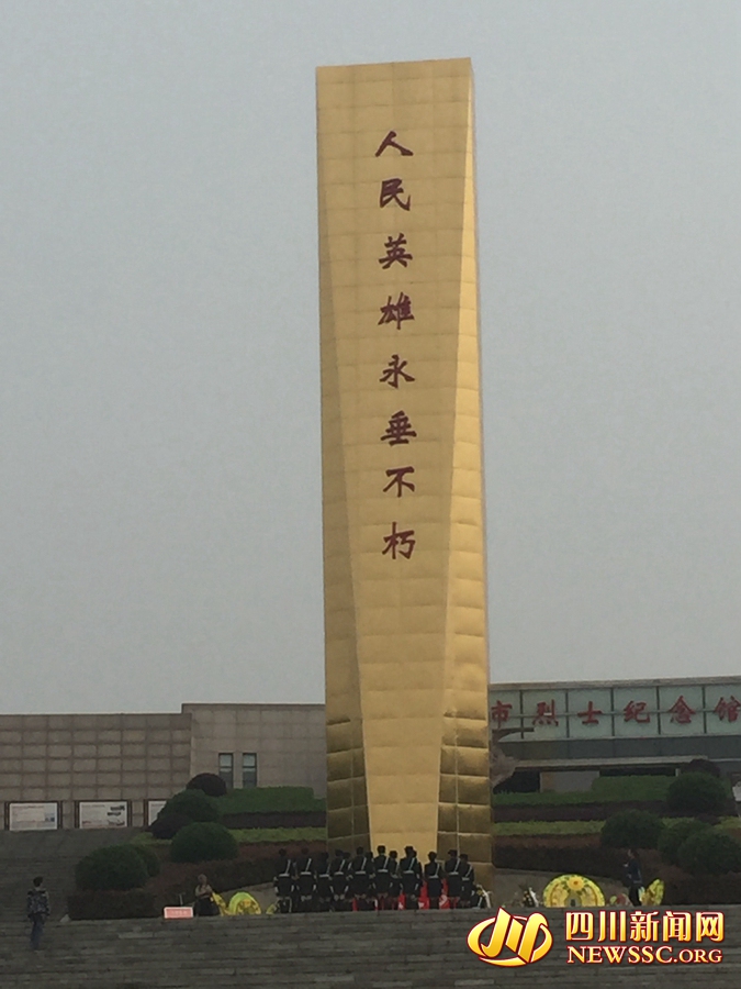 上午9点,记者在成都市烈士陵园看到,金色的烈士纪念碑前,已被自发前来悼念的市民用鲜花围成一个圈。