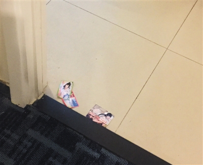 7日凌晨,朝阳区7天连锁酒店(华威店)5楼客房门口的色情小卡片。
