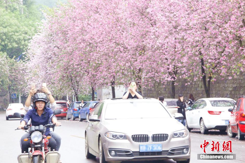 路过市民在拍摄紫荆花。 朱柳融 摄