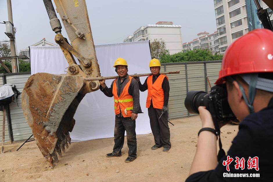4月7日,山东济南,英雄山路与万寿路交叉口路南工地上,山东师范大学摄影系20余名大学生来工地免费为农民工拍照,并帮他们寄回给亲人。据了解,由于许多农民工常年在异乡打工,很少能回家一趟,因此在工地上,大学生给农民工免费拍照片,并询问农民工对家人有什么想说的话,把这些话记下来后,再由大学生们把冲好的照片连同农民工写下的话一起寄回农民工的家,让他们的家人了解他们真实的现状。陈宁 摄 图片来源:东方IC 版权作品 请勿转载