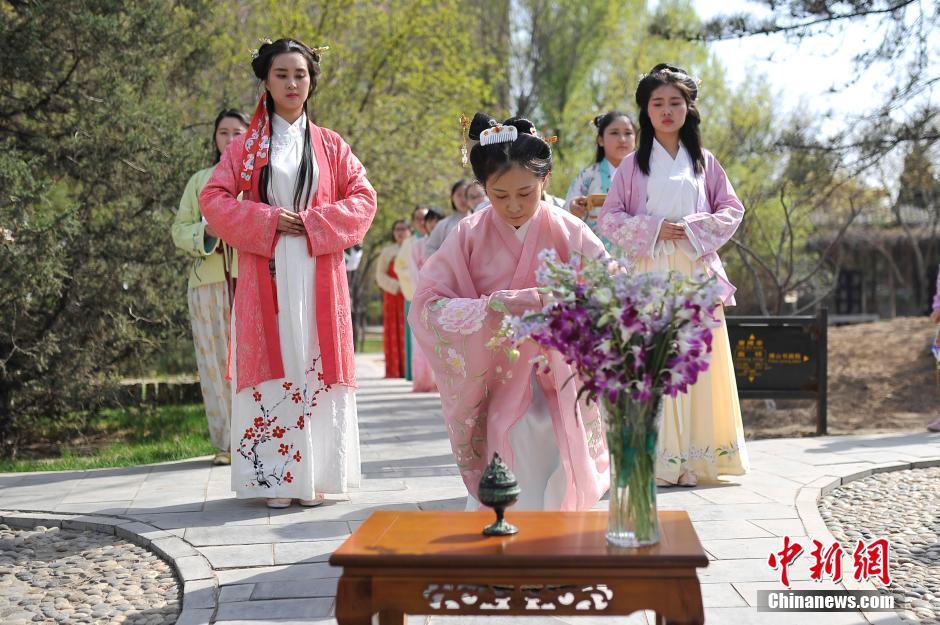 4月9日,农历三月初三上巳节,山西汉文化社近百名成员们齐聚太原市碑林公园,身着中华民族传统服饰,祓禊,流觞,以复古的方式度过传统佳节。上巳节是中华民族最古老的节日之一,早在《周礼·春官·女巫》中就有记载,这一天人们往往在水边以兰草祓禊,洗濯去垢,消除不祥。韦亮 摄