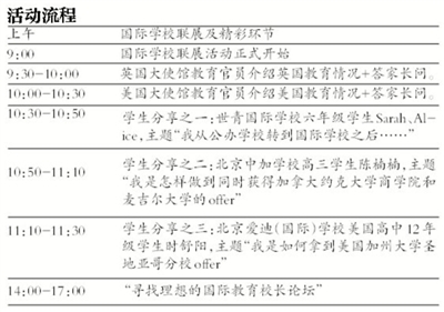 据主办方介绍,今年新京报国际教育活动分为两部分,在上午的国际学校联展上,北京爱迪(国际)学校、北京四中国际校区暨佳莲学校、北京二中、北师大亚太实验学校、北京王府学校等近30所知名国际学校、公办学校国际部将悉数到场,现场解答学生和家长的咨询,发布2016年最新的招生政策,以及指导学生如何更好地适应国际学校、国际班的学习生活。当日,主办方还邀请了英美等国家驻华使馆教育官员现场为家长介绍该国的留学政策并接受家长提问。此外,来自世青国际学校、北京中加学校、北京爱迪学校的三名学生,还将现身说法,与家长分享自己在国际学校的学习经验。