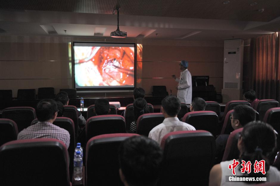4月10日,来自云南各州市神经外科、神经内科、儿科等学科的基层医生聚集昆明三博脑科医院,通过实时影像直播,观看学习世界神经调控学会中国分会主席栾国明等3位专家针对癫痫、垂体瘤、面积痉挛三台手术的实时过程。图为基层医生聚在一起观看手术直播。中新社记者 任东 摄