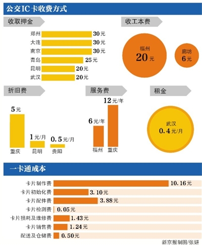 购买公交IC卡,碰到收取押金、服务费的情况屡见不鲜。昨日,新京报记者调查发现,目前多数城市的公交IC卡都收取押金,费用从10元到30元不等。不过,也有一些城市不收取IC卡押金,改收工本费。