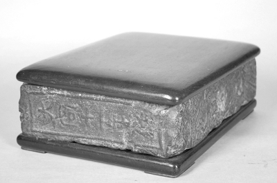 鲁迅从八道湾十一号寓所中拿出来的大同十一年(南朝梁武帝年号,公元545年)砖,长21.5厘米,宽17厘米,高8厘米,一边刻有“大同十一年作”,另两边有花纹,上下配有紫檀木盖托。鲁迅曾把这块方砖改制的砚放在书房“老虎尾巴”书桌上。该砖出土于浙江嵊县,系鲁迅的浙江嵊县籍学生商契衡于1918年所赠。鲁迅得到后拓出两份,自存或送人。