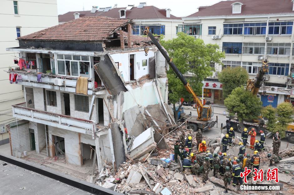 4月11日下午1时25分左右,上海松江佘山镇西霞路上一建于上世纪80年代中期的老房发生坍塌。该房下2层为9间店铺,3层住有6户居民。截至发稿时,消防人员抢救出1名妇女和1名幼儿。目前有疑似点发现了生命体征,抢救正争分夺秒地进行。 中新社记者 张亨伟 摄