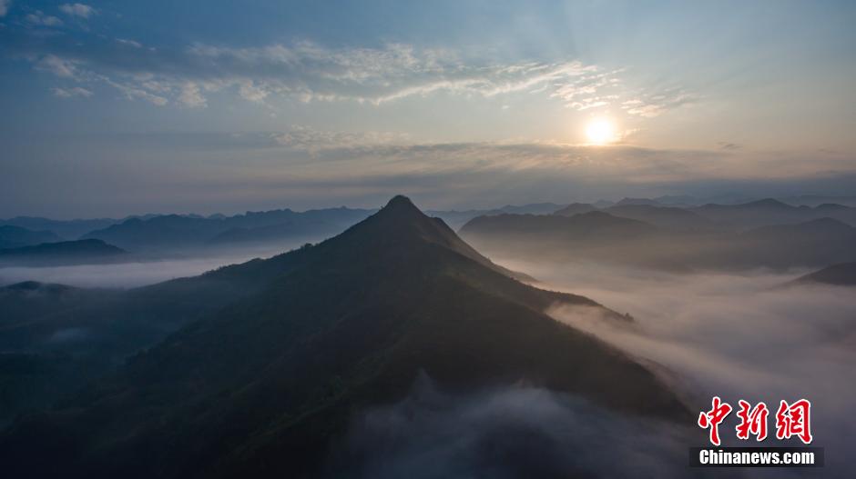 4月10日,航拍贵州省紫云县坝弄布依村寨。清晨,大雾笼罩布依族山村,美如仙境。 中新社记者 贺俊怡 摄