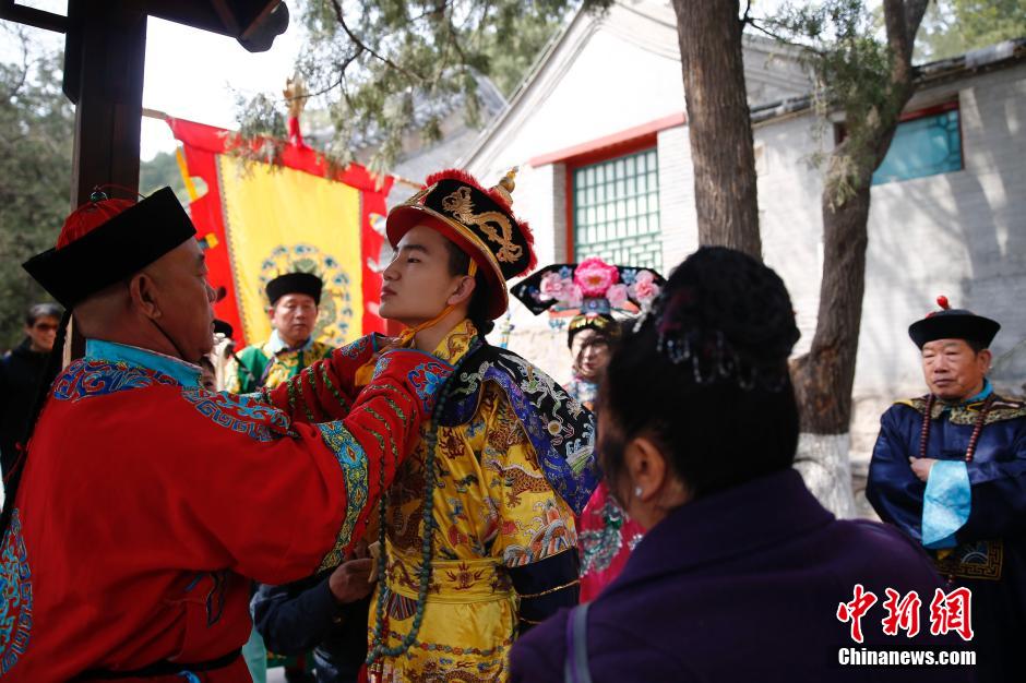 4月11日,北京八大处公园举行了龙泉庵古泉井开井仪式,“皇帝”带领众嫔妃,祭拜龙王后,亲自打开了古井,取出山泉水品饮,并将泉水交于茶人冲泡绿茶。八大处公园负责人称,龙泉井位于公园五处龙泉庵,龙泉井是目前西山仅存的一口活水古泉眼,四时不涸,经化验泉水为天然高锶矿泉水,是泡茶的上等水。每年工作人员都将进行对井进一次“清扫”,举办盛大的开井仪式。图为“皇帝”在仪式前整理服装。 中新社记者 盛佳鹏 摄