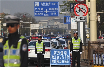 北京市公安交管部门近日发布“通告”,自4月11日起,长安街及其延长线等10条道路,除自行车外,禁止其他非机动车通行。昨日早高峰,交管部门在各条非机动车限行路段加大警力部署,在禁行道路两端及主要路口设置宣传卡控岗,对违反“通告”规定的车辆进行纠正并引导其驶离该路段。