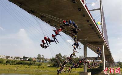 当地时间4月10日,巴西Hortolandia市,149名蹦极爱好者从当地的一座30米高的大桥上集体跳下,创造了集体蹦极的世界纪录。