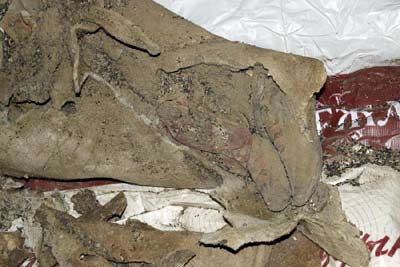 记者4月13日从蒙古国科布多省博物馆获悉,科布多省蒙赫海尔汗县发掘出一具罕见的完整千年干尸,并出土一批珍贵文物。本月初,当地考古专家对墓葬进行了抢救性发掘。目前,干尸及其他文物均存放在科布多省博物馆,干尸身上的衣物等还未完全揭开,研究人员正在开展进一步的研究和修复工作,以解开干尸更多谜团。图为4月5日在蒙古国科布多省拍摄的千年干尸的腿部。