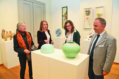 为期一个月的“新瓷——中国当代艺术陶瓷特展”4月13日在比利时布鲁塞尔中国文化中心开幕,展出的18位中国陶瓷艺术家的40余件作品融合了传统陶瓷制作工艺和当代艺术理念。图为观众在欣赏陶瓷作品。
