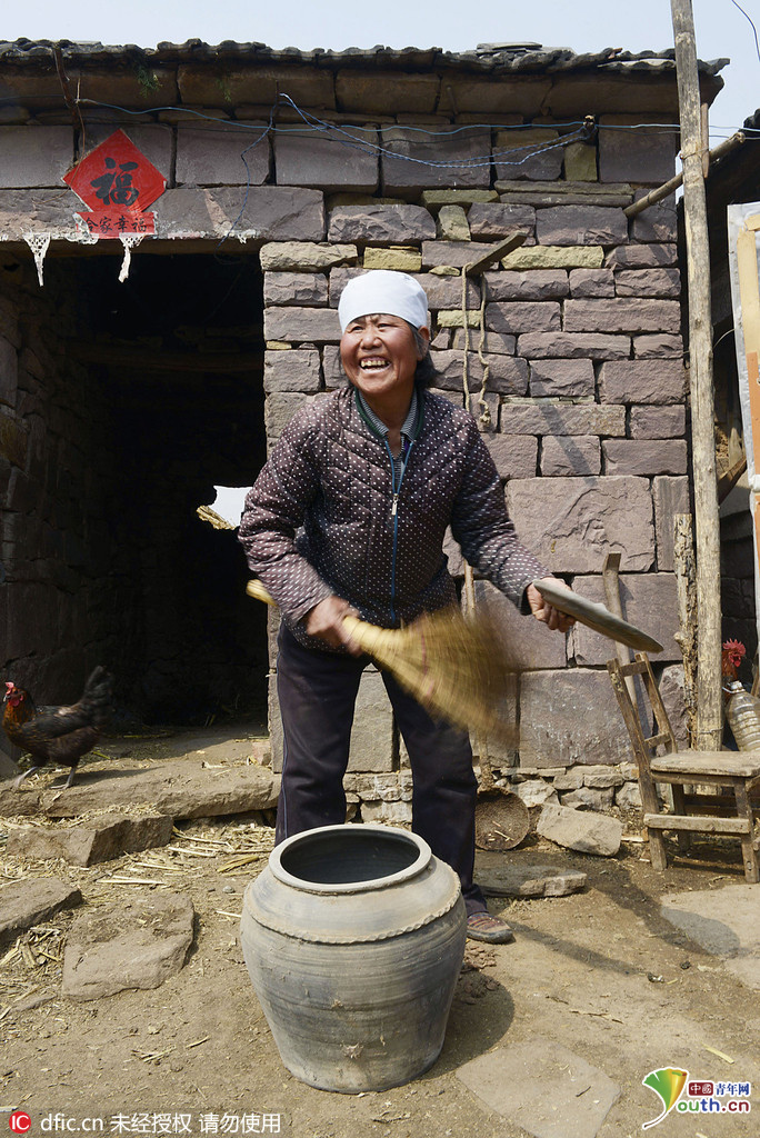 2016年4月7日,山东省日照市莒县桑园镇大岔河村,刘维花在收拾盛面粉的面瓮。