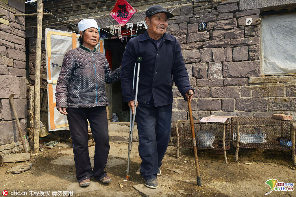 2016年4月7日,山东省日照市莒县桑园镇大岔河村,刘维花(左)搀扶丈夫陈爱祥散步。
