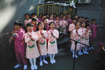 小学生们在校庆上诵读三字经。本版摄影/新京报记者 薛珺