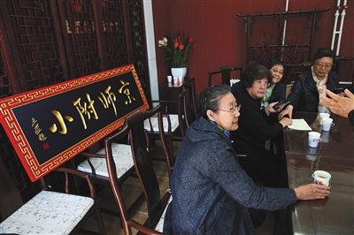 昨日,西四北四条小学133周年校庆上,老校长孙玉雯(中)和曾经任教的老教师们一起聊天,他们身后是学校更名后的新校牌。