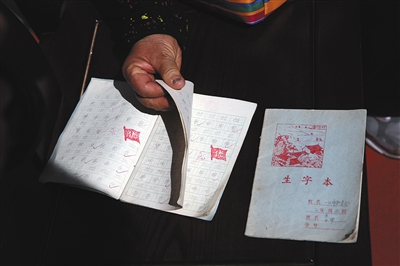 老教师展示珍藏的1963年“董浩叔叔”的小学作业本。