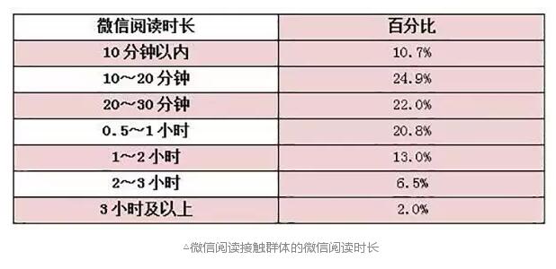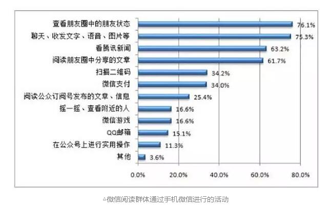 对微信使用情况的考察发现,2014年有34.4%的成年国民在2014年进行过微信阅读,在手机阅读接触者中,超过六成的人(66.4%)进行过微信阅读。成年手机阅读群体的微信使用频率为平均每天2次。从微信阅读时长来看,2014年我国成年国民人均每天微信阅读时长为14.11分钟,超过期刊阅读时长。