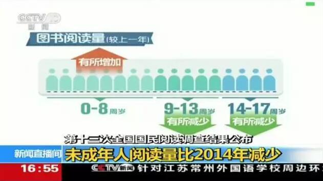 与成年人阅读保持增长的态势相比,青少年阅读的情况就不那么乐观了,调查显示未成年人的阅读率虽然显著上升,但阅读的量与2014年相比却减少了。