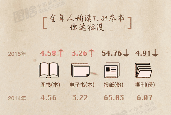 与阅读率相对应,2015年我国成年国民阅读报纸、期刊数量均有下降,图书、电子书阅读量有所上升,纸质书和电子书合计阅读量为7.84本,高于2014年的7.78本。