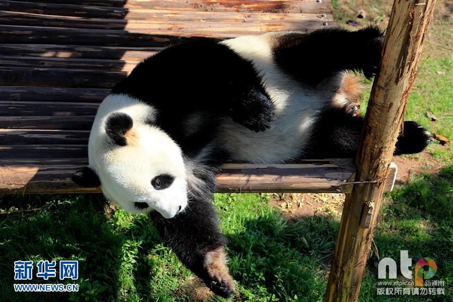 安徽黄山大熊猫沐浴春光 憨态可掬