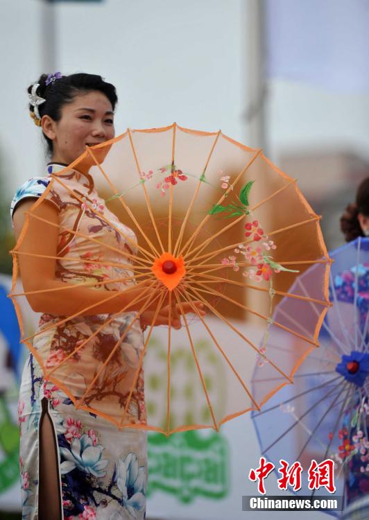 4月19日,穿着旗袍的观众在比赛间隙表演起旗袍秀,为前来参赛的各国运动员加油,也为赛场增添了一道靓丽的色彩。当日,2016世界沙滩排球巡回赛福州公开赛在福州拉开序幕。张斌 摄