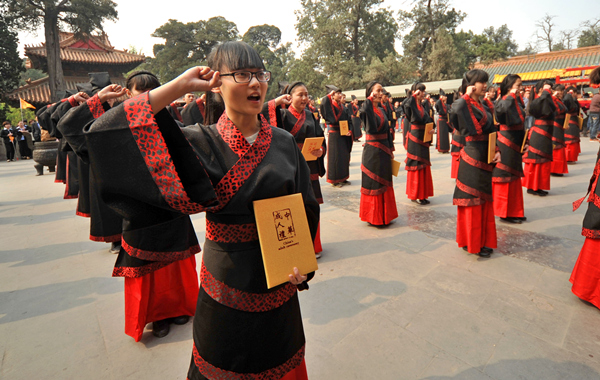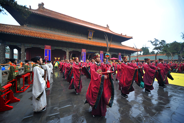 “千年礼乐归东鲁,万古衣冠拜素王”,每年阴历八月二十七日孔子诞辰,在曲阜孔庙大成殿都会隆重举行祭孔大典,上演“大成乐舞”。