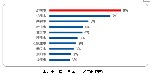 此外,统计显示,一季度济南的严重拥堵区块面积占比全国第一,约占规划城区面积的9%。,其次是杭州、西安、唐山、北京、郑州、石家庄、武汉、贵阳、福州。