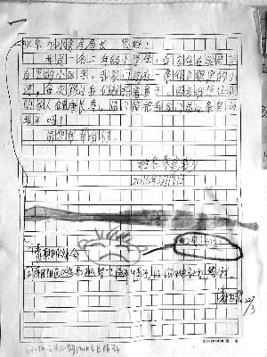 朱彦澎小朋友给北京市水务局局长的信里写道:“我家住在驼房营南里的小区里,我家门前有一条很臭很黑的小河,每次路过我们都捂着鼻子。我想让我的家人健康长寿,请问能把我家门前的臭河填平吗?请您帮帮我们。”信纸上还用彩笔画了一条河和一个小孩子瘪着嘴巴的脸,配上“台词”——“啊!好臭!”