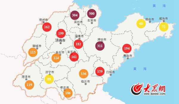 记者从山东省城市环境空气质量信息发布平台看到,截至22日上午9:30,山东17市中,有3市空气质量达到严重污染级别,其中东营市AQI指数达到了500的“爆表值”,潍坊市、东营市分别为311和304;仍有济南、青岛、字表、莱芜、日照、德州6市空气质量为中度污染,临沂、聊城、泰安、菏泽、枣庄市为轻度污染,济宁、烟台、威海市空气质量为良。