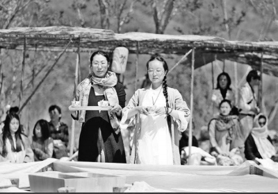 4月19日,200名雅士齐聚北京市平谷区乐和仙谷有机农场,启耕换装,礼敬天地万物,祭祀农神后稷。乐和仙谷主人贾海珍介绍,农场已经连续四届举办此公益活动,旨在通过仪式引导人们敬天法祖,对土地和农民心怀感恩。图为祭祀农神后稷典礼。 胡建党摄