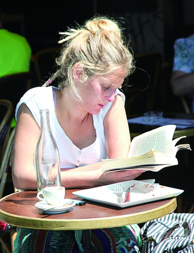 法国是全世界最喜欢读书的民族之一。无论旅游、上班、休息、用餐还是乘坐公交车,无论在塞纳河畔、咖啡馆还是在图书馆里……随处可见法国人在聚精会神地阅读。这是一位法国姑娘在巴黎街头咖啡馆里阅读。