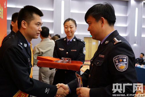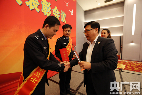 图为北京铁路公安局政治部主任姚勇为“十大杰出青年卫士“颁奖。