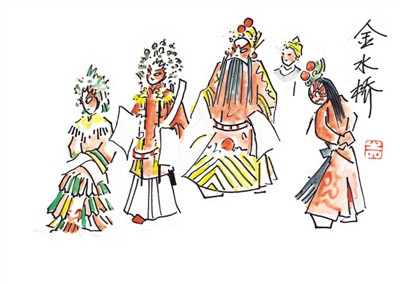 京剧《金水桥》又名《乾坤带》。讲述的故事是:摩沙国番王兴兵犯境唐朝,秦琼之子秦怀玉奉旨出征。秦怀玉本是驸马,他与银屏公主之子秦英,性情暴躁,臂力过人。秦英金水桥钓鱼,遇詹妃之父国丈詹太师鸣锣招摇过桥,锣声惊散游鱼,詹太师责秦英阻道不让,二人发生争执,秦英盛怒之下失手将詹太师打死。