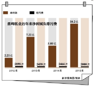 不过新京报记者发现,晨鸣纸业在排污费用上并未体现其前述所说的“排放标准的提高加大公司环保成本”,2015年,其排污费用为2000万元,这一数据在2012年为2898万元,整体呈下滑趋势。