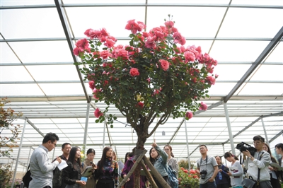昨日,游客在位于大兴区魏善庄的月季园区欣赏300岁高龄的古桩月季。新京报记者 吴江 摄