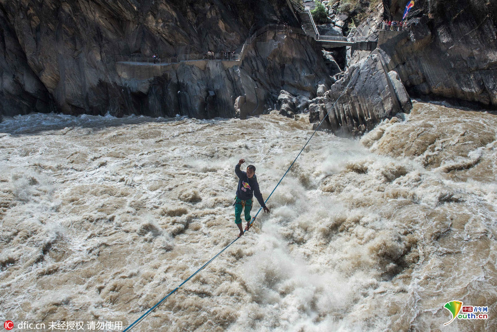 最终张亮还是决定挑战。在现场近千名观众的注视下,张亮在上午11点41分开始了正式挑战。他从扁带在虎跳峡丽江一侧的起点出发,缓缓踏出了第一步。峡谷内时不时刮起阵阵大风,张亮在扁带上摇摇欲坠,多次差点就掉下去,引起了现场观众的阵阵惊呼。但他凭借超群的实力,在耗时5分58秒后稳稳地站在了虎跳峡香格里拉一侧的终点上,完成了挑战。