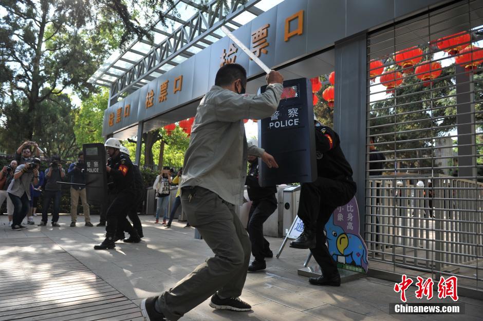 4月26日,昆明华山东路派出所与昆明动物园共同举行了反恐应急演练。两名“歹徒”在动物园门口持刀“砍倒”检票员后被保安阻挡未能进入公园,反身走向售票处继续“行凶”,之后被赶到现场的华山东路派出所民警当场“击毙”。图为动物园保安持盾牌阻挡“歹徒”进入公园。 中新社记者 任东 摄