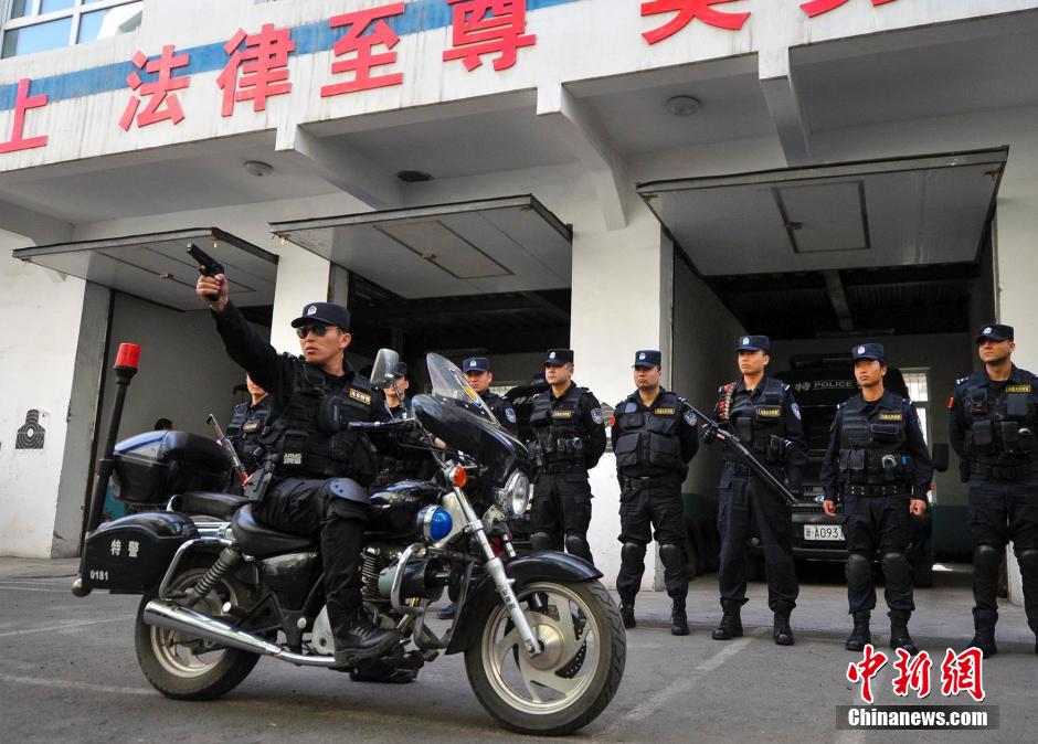 4月26日,新疆乌鲁木齐市公安局特警八支队的特警队员正在熟悉“防抢快速上膛92式手枪枪套”在实战中的应用技巧,并试穿新型防弹背心及头盔,体验其防护功能。“防抢快速上膛92式手枪枪套”具有携带方便、防盗抢、单手快速上膛等特点,可大大缩短特警队员在日常勤务、摩托车骑行、驾车时单手使用枪械的速度,提升处突能力。据介绍,这些新型处突警用装备将于近期配发到该特警支队部分队员手中。图为特警队员测试在骑行摩托车时,使用该枪套完成单手快速上膛、拔枪射击的完整动作。 刘新 摄