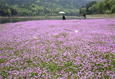 湖南省常德市鼎城区花岩溪镇,百亩紫云英花开了。这里的农民很聪明,秋收过后,就在稻田里撒上紫云英的种子。待来年春天,春风拂过紫云英花开,稻田里便也迎来了新的财富。