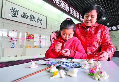 山西非物质文化遗产代县面塑传人张桂英正在传授孙女面塑手艺。资料照片