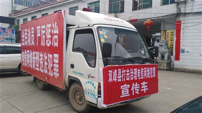 在双峰县各乡镇,宣传车走遍村落,用高音喇叭循环播放政府打击电信网络犯罪的宣言。