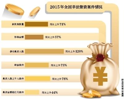 杨玉柱称,2015年全国非法集资新发案数量、涉案金额、参与集资人数同比分别上升71%、57%、120%,达历年最高峰值,跨省、集资人数上千人、集资金额超亿元案件同比分别增长73%、78%、44%。