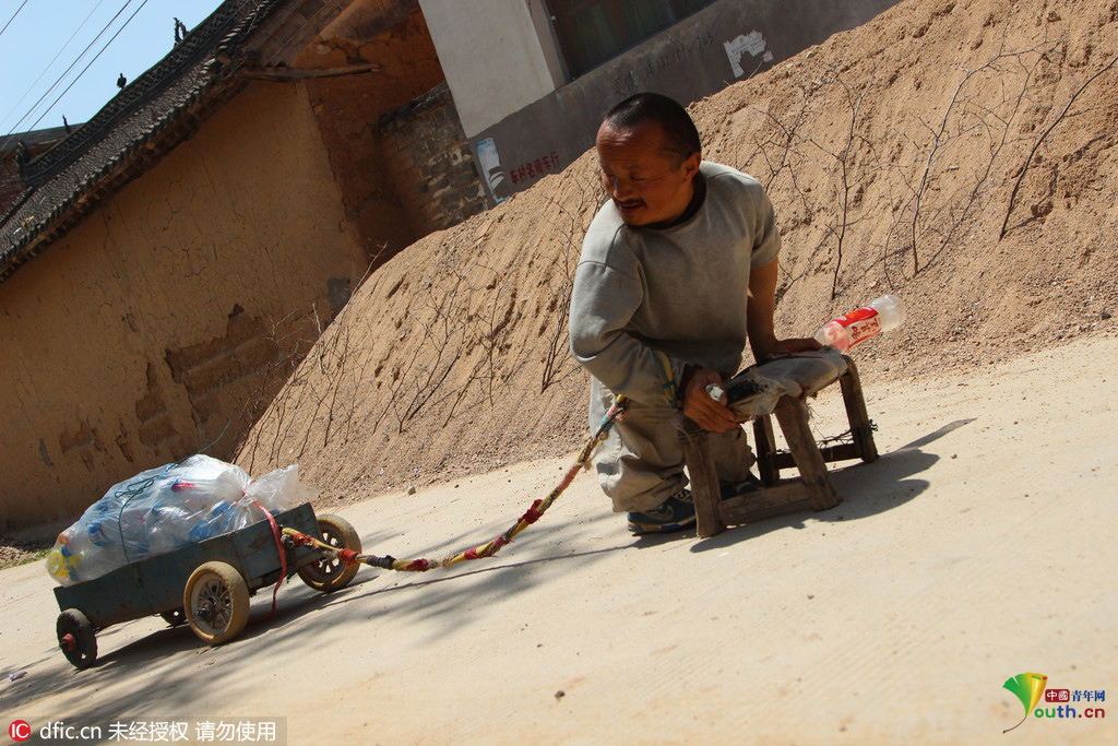憨娃的母亲说,娃子身体不方便,就打造了个小车,用板凳挪动着走路,看见了废品就放到车上,由于目前废品价格下跌,现在的收入也下降了,一天下来也就是几元钱。