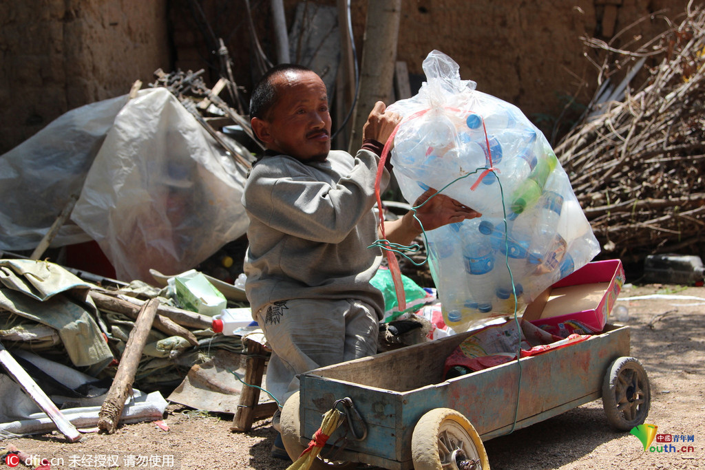河南"1米憨娃"用板凳行走 捡垃圾换钱养86岁母亲