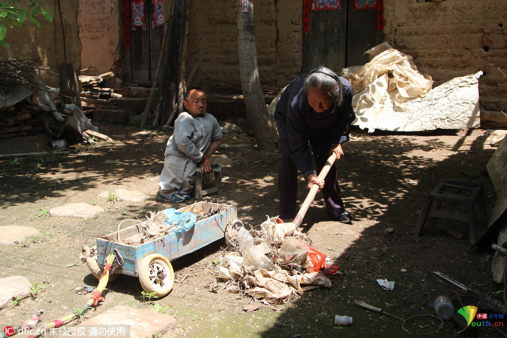 河南"1米憨娃"用板凳行走 捡垃圾换钱养86岁母亲