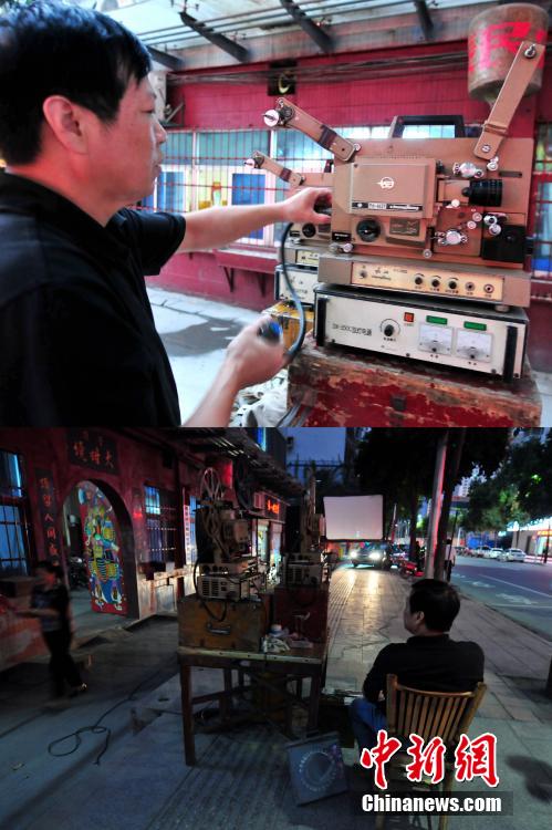 放了一辈子电影的福州电影放映队放映员老林,在调试上世纪80年代的长江牌放映机。随着数字时代的到来,原来只能通过电影放映才能看的影片现都能通过网络和电视观看。几天的放映,只吸引了一些老年人前来观看,一些过往的市民只是好奇地停下脚步,让他们回忆起过去观看露天电影的美好时光。(拼版图片)(资料图片)中新社记者 张斌 摄
