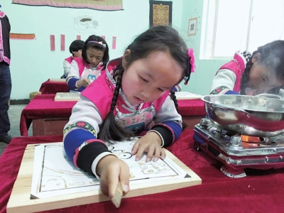 在贵州省仁怀市后山苗族布依族乡中心小学,大部分孩子是留守儿童。为了更好地传承民族技艺,学校开设了具有少数民族特色的民族歌舞、刺绣、蜡染、器乐等课程,从小培养孩子们学习民族文化的兴趣。图为二年级的学生在老师的指导下学习蜡染画技艺。 本报记者刘久锋摄